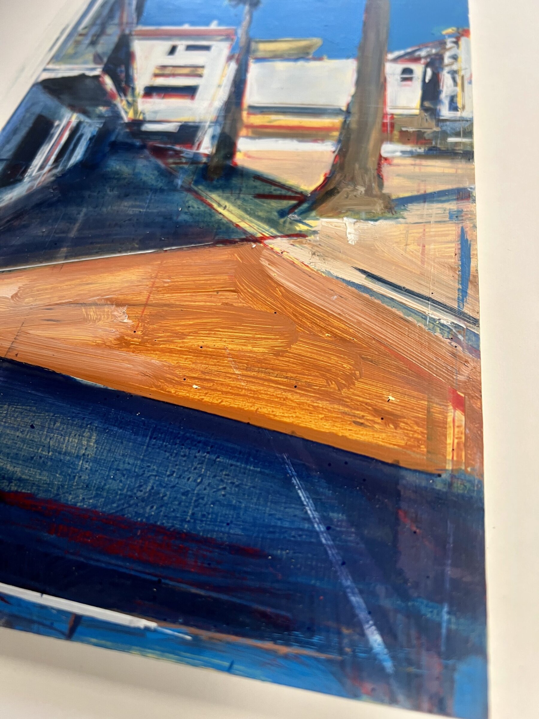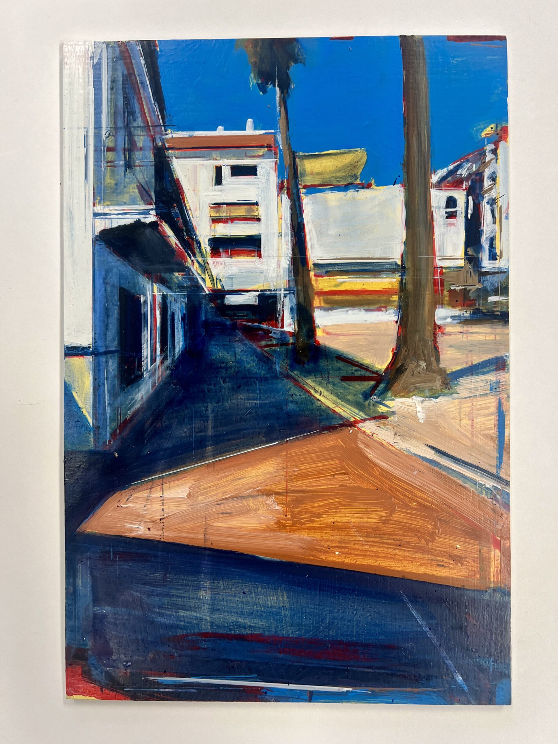 - About the artwork –This painting depicts a courtyard scene developed from a series of drawing studies made in and around the town of Arroyo de la Miel in southern Spain. I visited this area several times when I was younger, and its architecture has stayed with me. The small courtyards scattered throughout the town still carry a strong sense of traditional Spanish character.