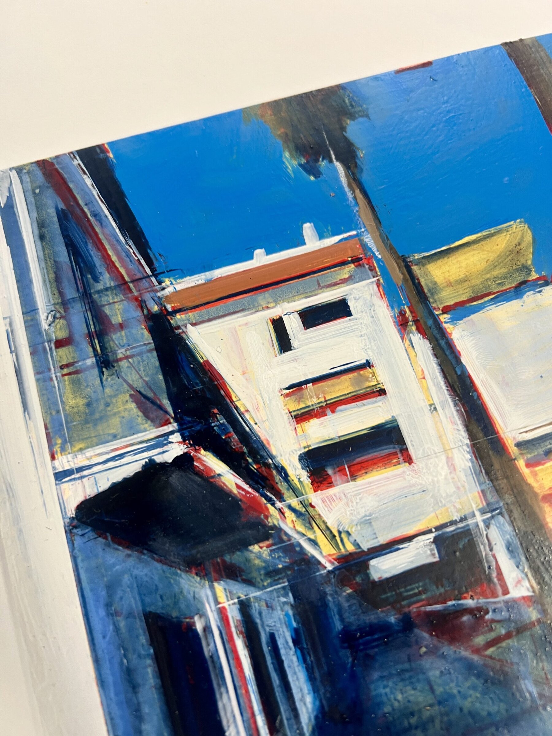 I was particularly drawn to the warm pink floor tiles, which contrast with the whitewashed walls and, beyond them, the deep blue of a Mediterranean summer sky. The crossing shadows create a layered composition of shapes and angles – something I continually find myself drawn to when working from architectural spaces like these.
